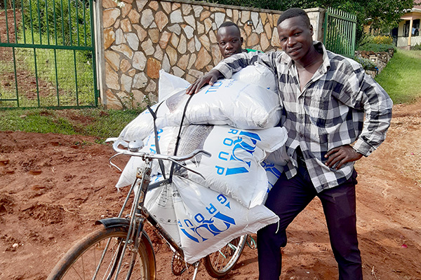 Im Kübel sind die kleinen Tilapias, die nur etwa ein Gramm schwer sind. Sie werden bei uns zu 400g-Tilapia gefüttert und dann verkauft. Wir haben unsere Käfigkapazität in diesem Jahr von einem zu drei Käfigen erweitert, um den Ertrag zu erhöhen. Nun ist es Zeit, einen Futtervorratsraum zu bauen. Den bauen wird auf dem Farmgelände, damit die aufwändigen Futtertransporte per Fahrrad wegfallen.