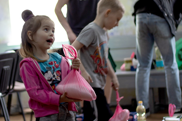 In der Turnhalle ist es zwar kalt, dafür haben alle Kinder hier Platz. Heute gibt es ein Programm mit Spielen, Bewegung, einer Bibelgeschichte, Basteln, Malen und Stoffaffen als Geschenk für die Kinder.